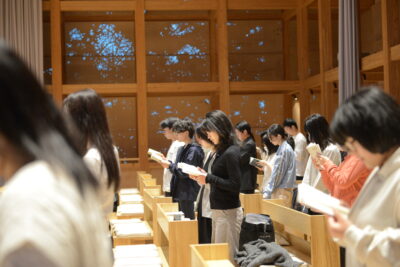 お二人は現在、ご自身の経験を生かして入所者と共同生活をしながら回復の支援をなさっています。近年、『薬物乱用防止教室』といった内容で、学校など多くの施設から講演を依頼されることが多いそうです。昨年度にいらした時には、図書館棟三階の旧礼拝室でのチャペルでした。今回は新木造校舎二階での実施となりました。お二人共が同様に「この場所は神聖な雰囲気があり、しかも学生さんと距離も近くて話をしにくいです」と語っておられたことが印象的でした。お話の対象はキリスト教主義の短期大学の学生です。ただ単に『危険だから』というだけでなく、『なぜ依存症になってしまうのか、なぜそこから抜け出しにくいのか』、ということを、より具体的、心情的に語ってくださいました。最後に経験者として『誘惑やしがらみとはあらがわずに、逃げてください。そして、怖がらずに誰かに相談することがとても重要です』 と語ってくださいました。今日のお話は、自らの失敗や犯した罪を神様の前で告白するもので、キリスト教的には『悔い改め』の行為そのものです。苦難を乗り越えた今、現在の歩みは多くの苦しみをかかえた人たちに寄り添うものとなっています。本日は貴重なお話をありがとうございました。