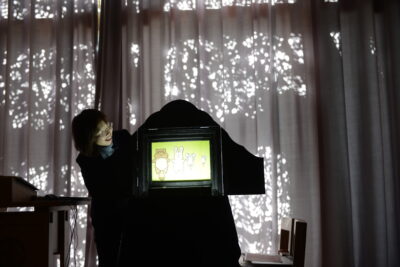 最後には、実際に紙芝居を一幕上演してくださいました。複数の登場人物はそれぞれ声色を変えます、画面をめくるタイミングやその入れ替えの速さなど実によく工夫が凝らされ、技術の高さがうかがえます。紙芝居舞台の限られた空間の中に思わず引き込まれてしまいました。会衆が想像力を働かせながら視聴することで、より内面的に深みのある世界が繰り広げられていることを感じました。先ほど【世界に類を見ない日本独自の芸能だ】と記しましたがまさにその通り、能や人形浄瑠璃、などにも似た伝統芸能だと感じました。本日のチャペルアワーは大変興味深く心に残る時間となりました。岡部先生、本日は素晴らしい奨励をありがとうございました。