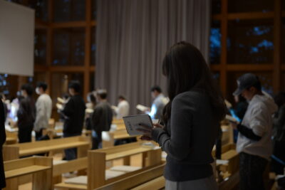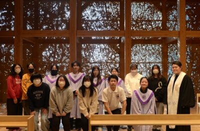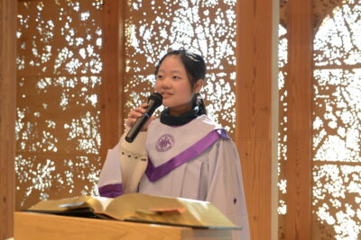 学生チャペルは、聖歌隊の皆さんはもちろん、司式、奏楽、奨励、祈祷など、チャペルのほとんどの役割を学生代表が担当して実施されています。今回の奨励者は、キャリアデザイン学科1年の藤井大輔さんと、コミュニティ子ども学科1年の本田聖歌さんでした。藤井さんは学生時代にこそ可能なひとり旅のエピソードをご自身で撮影したたくさんのスライドを利用してお話しくださいました。本田さんは現在、大好きなご家族と離れて一人暮らしをされています。本田家はクリスチャンホームです。小さな時から神様を身近に感じながら育った様子を赤裸々に語ってくださいました。学生チャペルは、等身大の大学生の本音が垣間見えるので、毎回楽しみです。友達の話を聞けるとあって、学生チャペルの時には参加者が多い傾向があります。自らの夢を実現させようと家族と離れて一人暮らしをしたり、長期の休みに趣味を生かした人生経験を積む活動に没頭したり。まさに『青春まっただ中』を感じさせるスピーチになりました。この年末年始、大きな寒気がやって来ました。上州、群馬県らしい乾いた寒風の吹く冬の候、ここ新木造校舎二階『新島の森』は、大学1年生の素直で新鮮なお話に、おもわず会衆の笑顔があふれました。聞く人すべてが思わずうなずいてしまうような心に残るチャペルになりました。
