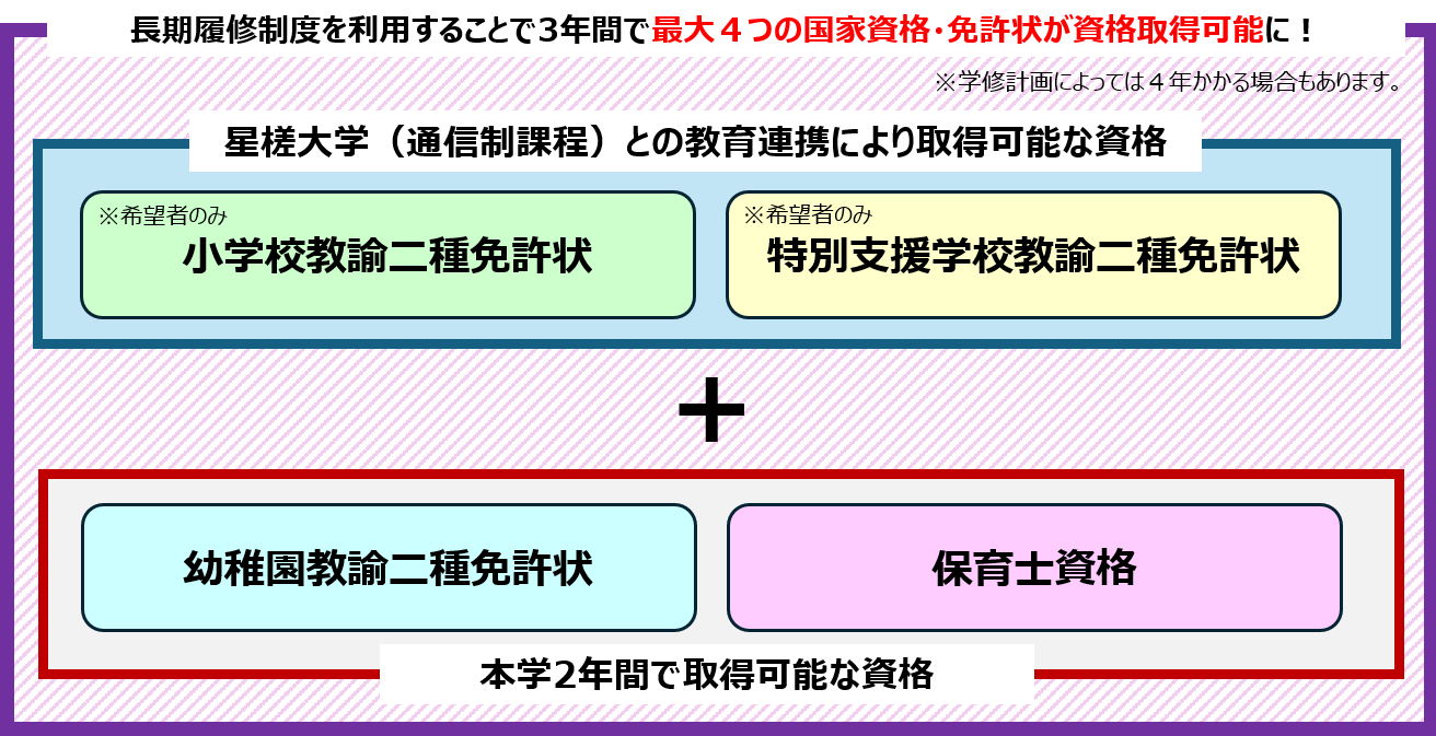 - 今回の教育連携により、本学で取得できる幼稚園教諭二種免許状、保育士資格等に加えて、小学校教諭二種免許状、特別支援学校教諭二種免許状を取得するためには、長期履修制度を利用して3年(または4年)かけて無理のない学修計画を立てて学ぶ必要があります。