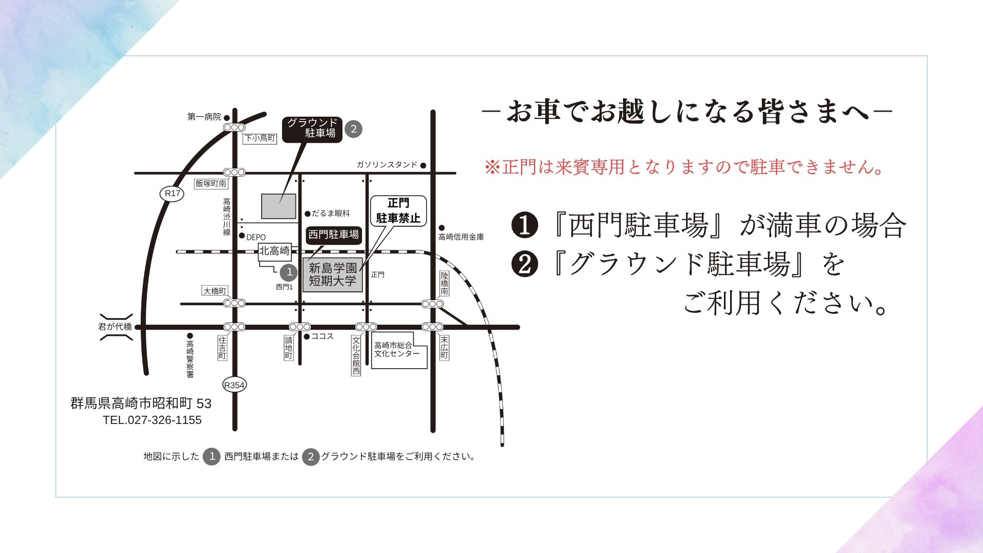 駐車場台数に限りがあります。大学周辺道路への駐車は厳に慎んでいただき、近隣住民へのご迷惑とならないようお願いいたします。